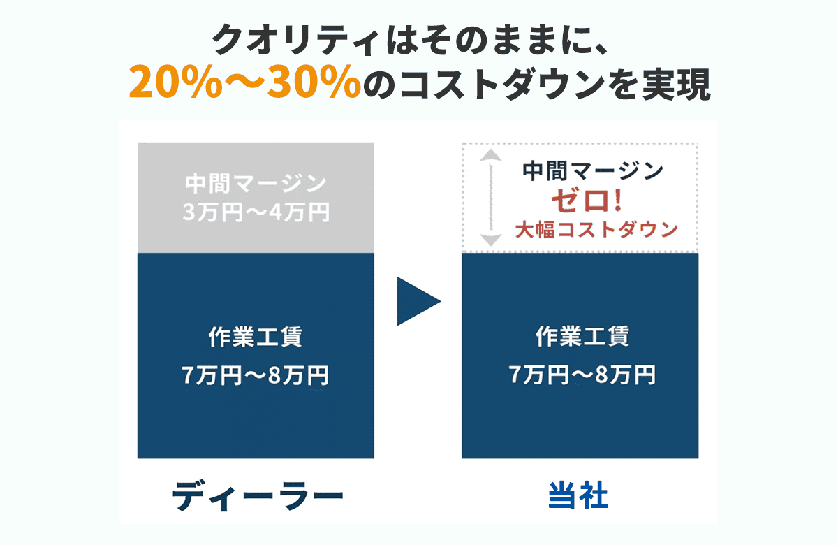 カーディーラーで頼むと、作業自体を下請けの整備工場やガラス工場に依頼するので、中間マージンが発生しますが、当店は施工まで一貫して対応するので、その分お安くなります!